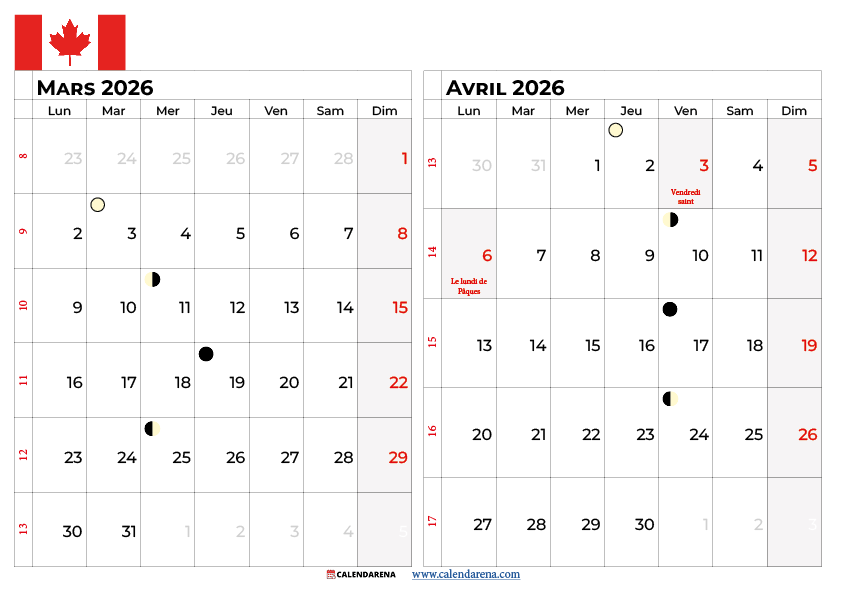 Nos modèles Calendrier Mars Avril 2026 Québec présentent les deux mois côte à côte ou en format vertical, incluant :
