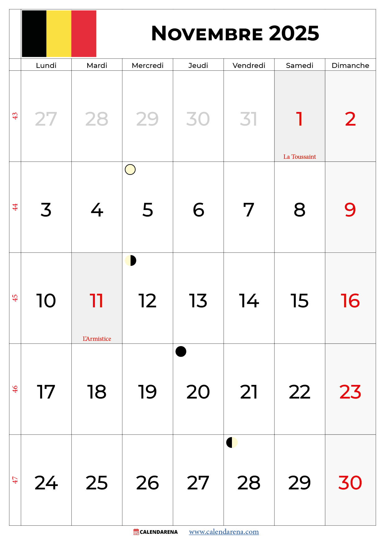 Un Calendrier Novembre 2025 À Imprimer Belgique est un outil essentiel pour organiser efficacement votre temps et vos activités. Avec les jours fériés nationaux, les vacances scolaires, les phases lunaires et les événements culturels à portée de main, vous serez parfaitement équipé pour aborder ce mois avec sérénité et organisation. N’attendez plus pour télécharger gratuitement votre calendrier en format PDF ou JPG et commencez dès maintenant à planifier votre novembre 2025 en Belgique!