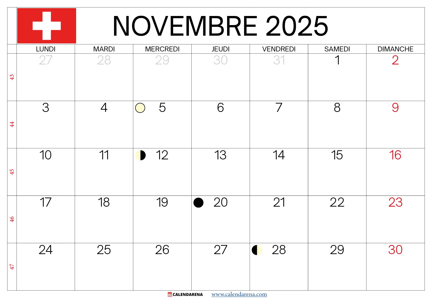 Calendrier 2025 Novembre Suisse