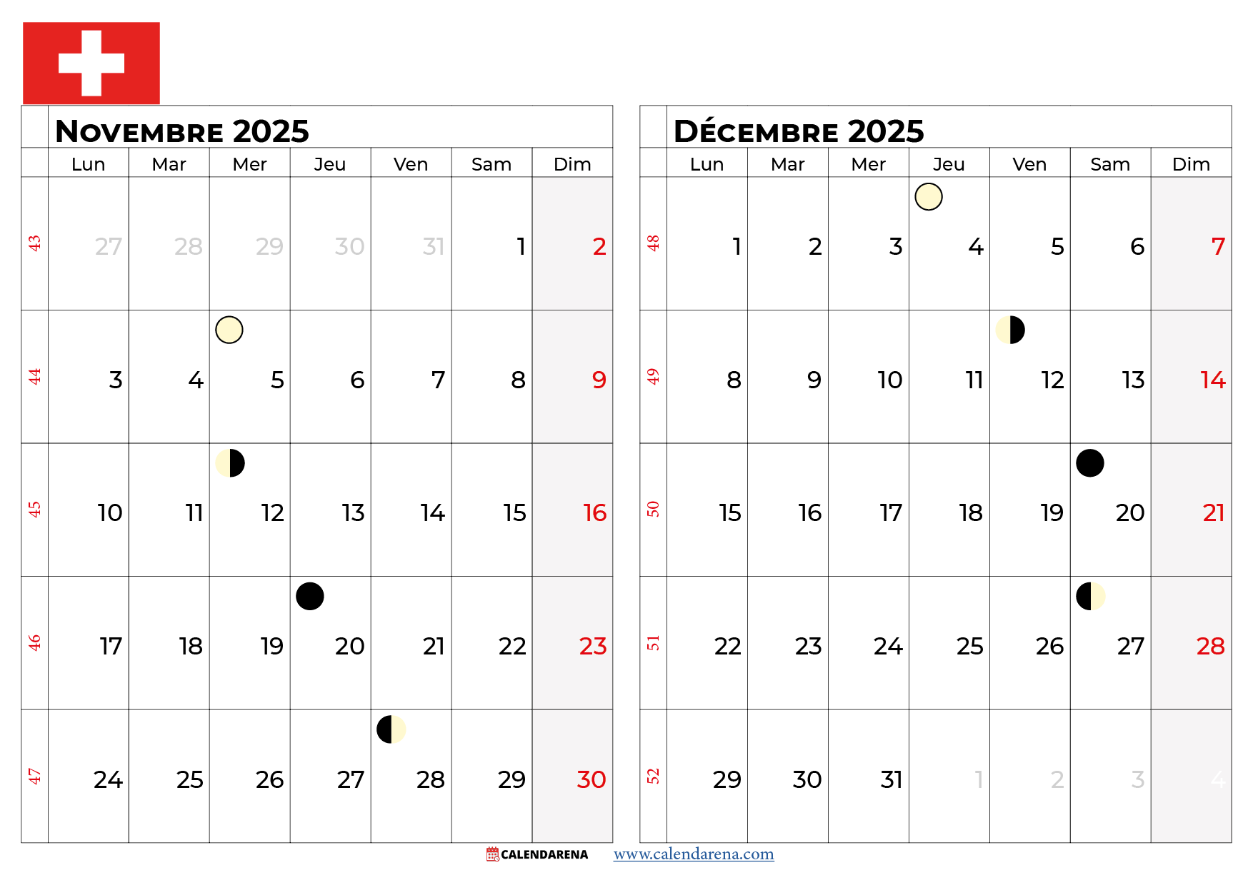 Pour une meilleure vision à moyen terme, notre Calendrier Novembre Décembre 2025 Suisse vous permet de visualiser ces deux mois cruciaux de fin d’année sur un seul document. Cette perspective élargie est particulièrement utile pour: