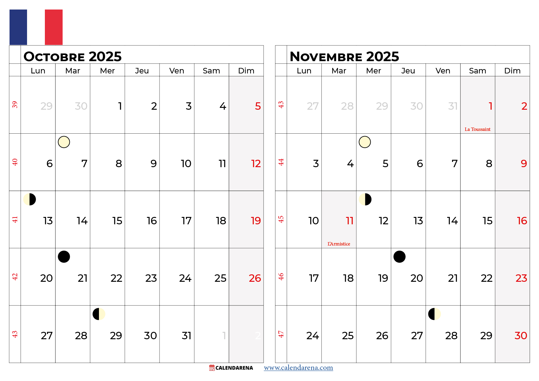 Calendrier octobre novembre 2025 France