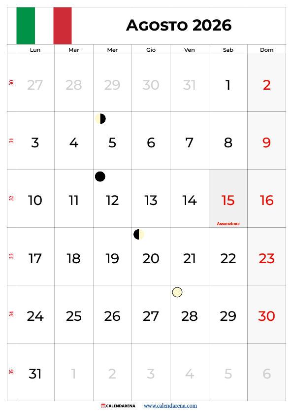 Il mese di agosto 2026 inizia sabato 1 agosto e termina lunedì 31 agosto, per un totale di 31 giorni distribuiti su 6 settimane. È il secondo mese per numero di giorni lavorativi ridotti, grazie alla festività di Ferragosto e alle ferie diffuse in tutta Italia.