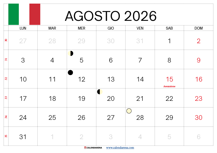 Il calendario di agosto 2026 si distingue per alcune caratteristiche particolari: