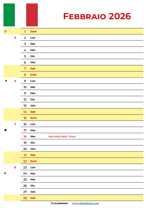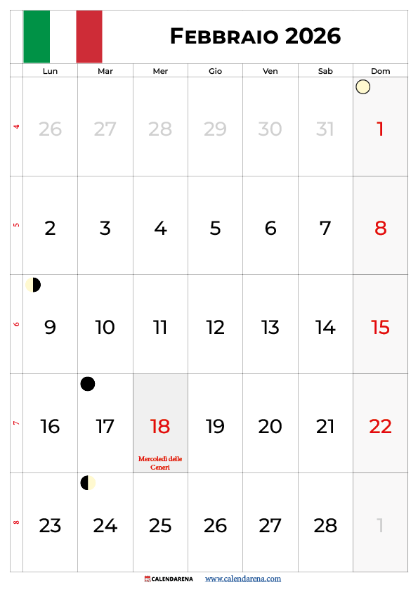 Il Calendario Febbraio 2026 Con Festività include le seguenti date importanti per l’Italia: