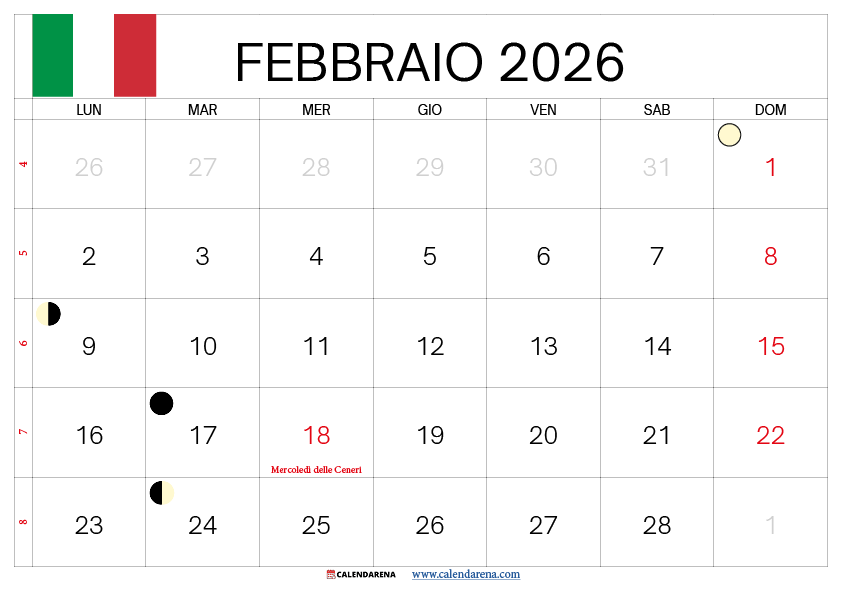 Calendario Febbraio 2026 Gratis Da Stampare