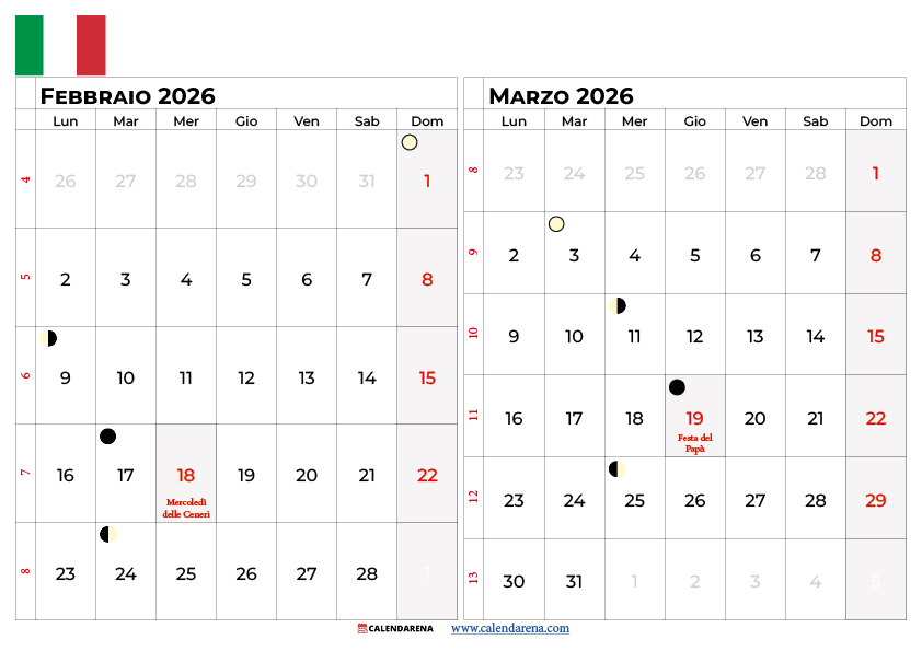 Calendario Febbraio Marzo 2026