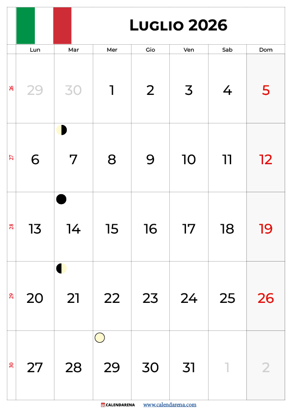 Il luglio 2026 calendario si inserisce nel cuore dell’estate italiana: le temperature raggiungono i picchi massimi in tutta la penisola, il turismo balneare è al massimo e molte aziende entrano in regime di orario ridotto o chiusura feriale. Per questo motivo, avere una visione chiara di tutto il mese — con settimane numerate, weekend evidenziati e note sulle festività locali — è uno strumento operativo fondamentale.