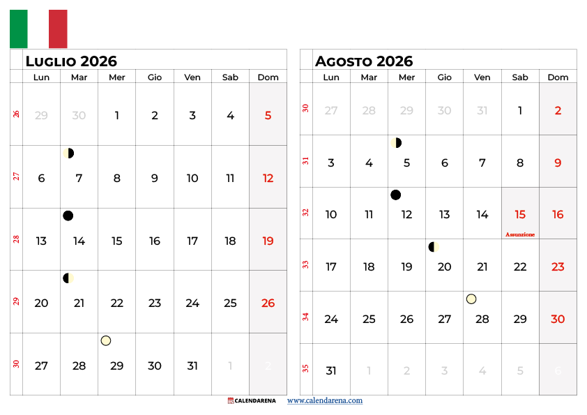 Il calendario giugno luglio 2026 bimestrale è altrettanto utile per chi vuole un’unica visualizzazione del periodo estivo da giugno a luglio, prima del picco di Ferragosto.