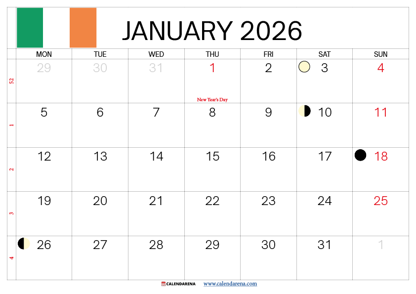 The January 2026 Calendar Ireland serves as your essential planning companion for starting the new year with organization and intention. From tracking the New Year’s Day holiday to monitoring moon phases and personal goals, these free printable templates provide the foundation for effective time management throughout the month.