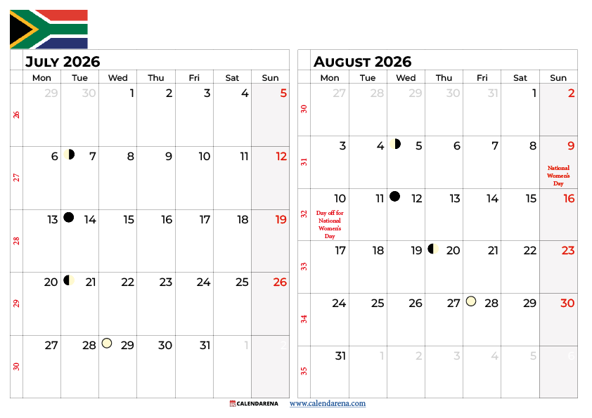 July And August 2026 Calendar South Africa