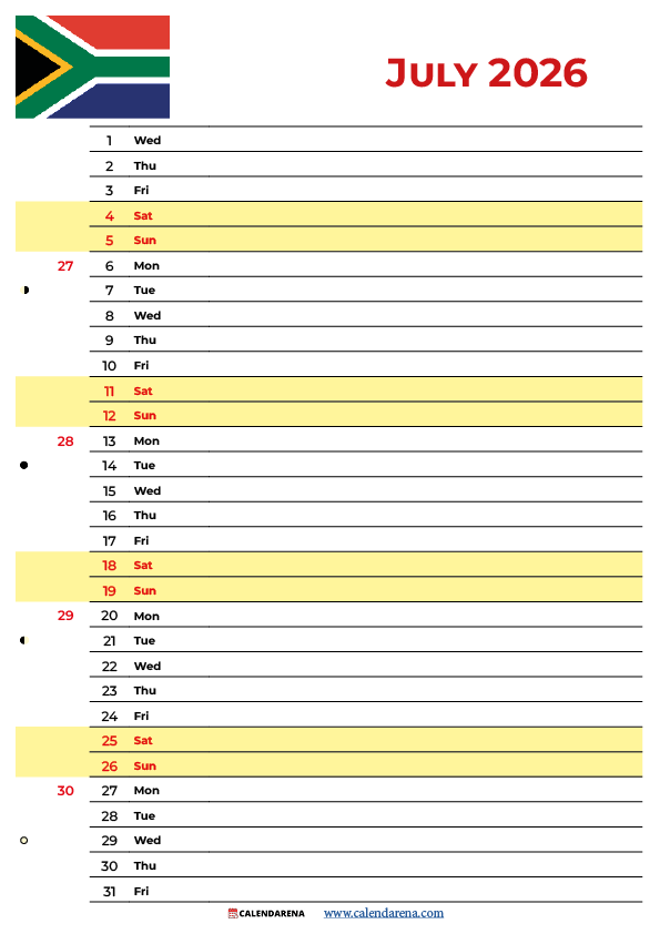 The July 2026 calendar begins on Wednesday, July 1st and ends on Friday, July 31st, giving you 31 days to plan and execute your goals. This month holds special significance for South Africans as it features Nelson Mandela Day, one of the nation’s most important observances dedicated to community service and social change.