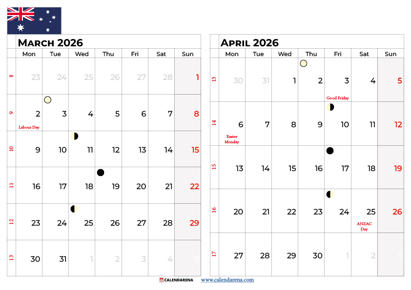 Viewing Calendar March April 2026 Australia together provides extended planning perspective: