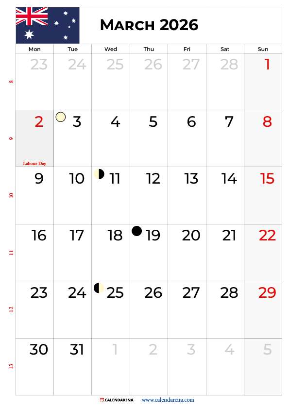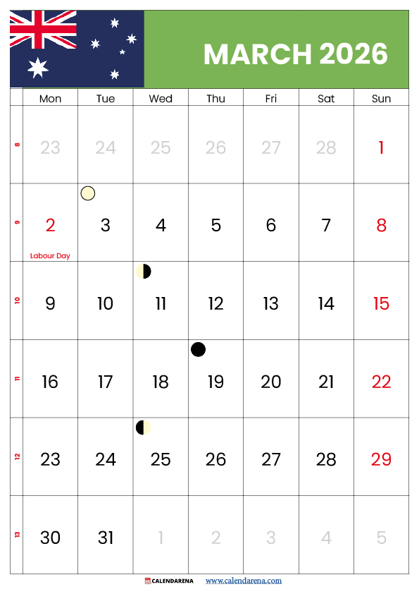 March 2026 begins on Sunday and contains 31 days, offering five complete weeks for planning and scheduling. This month marks the official start of autumn in Australia, bringing cooler temperatures and the anticipation of seasonal changes.