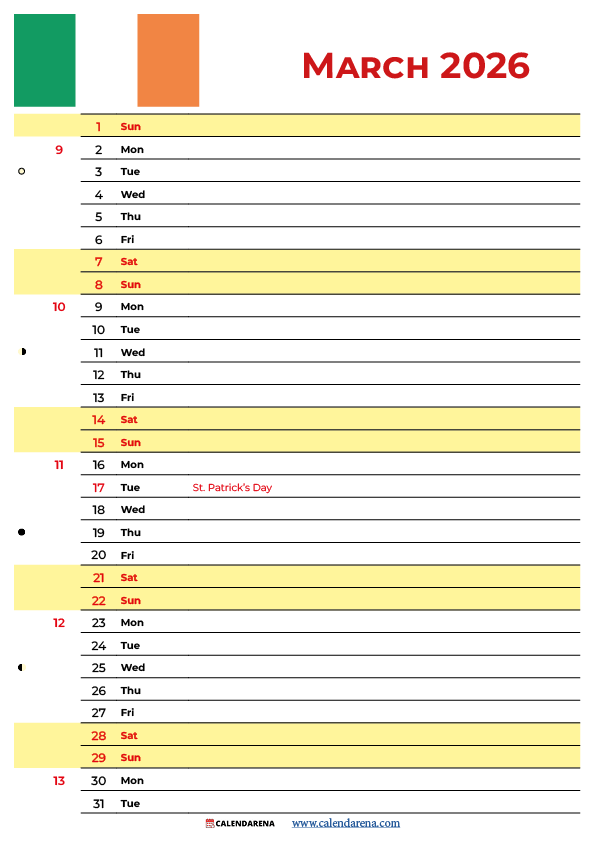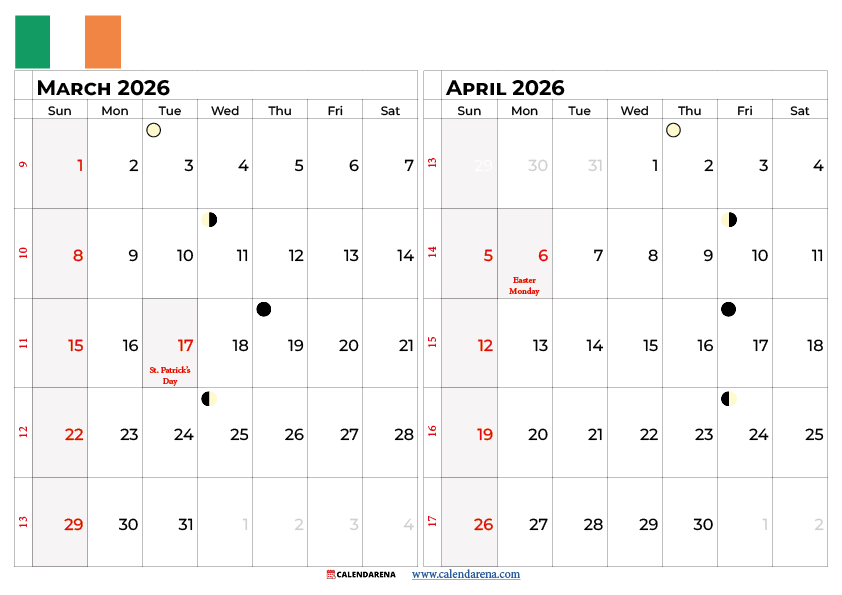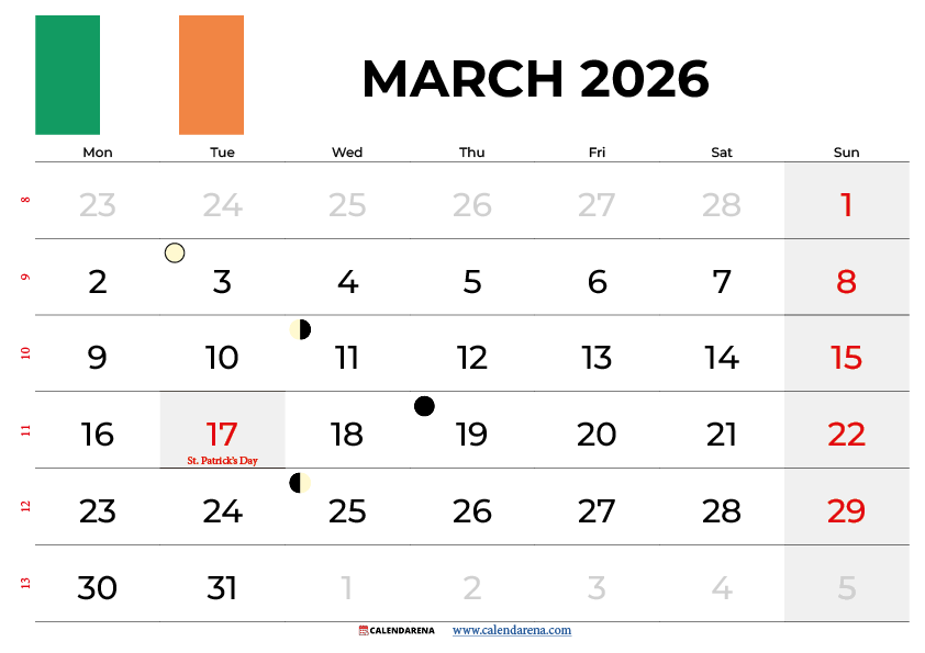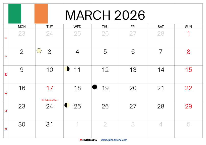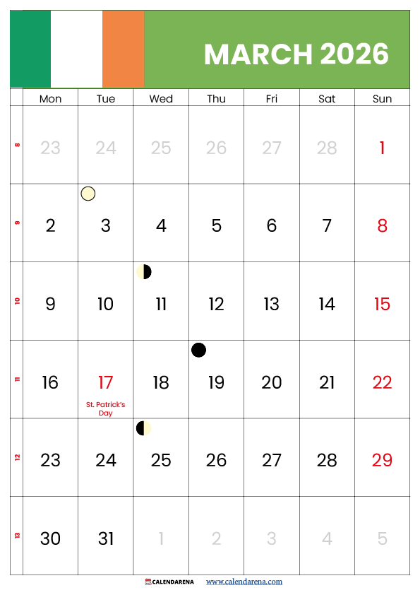 The March 2026 Calendar Ireland begins on Sunday, March 1st, and concludes on Tuesday, March 31st, spanning 31 days across five weeks. This month holds special significance for Irish residents as it features the nation’s most celebrated holiday, St. Patrick’s Day, alongside other important observances.