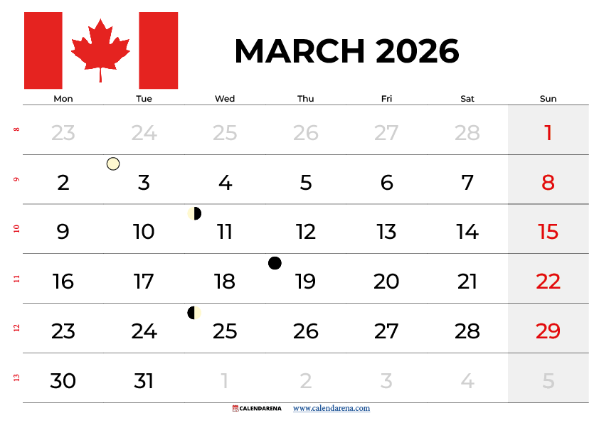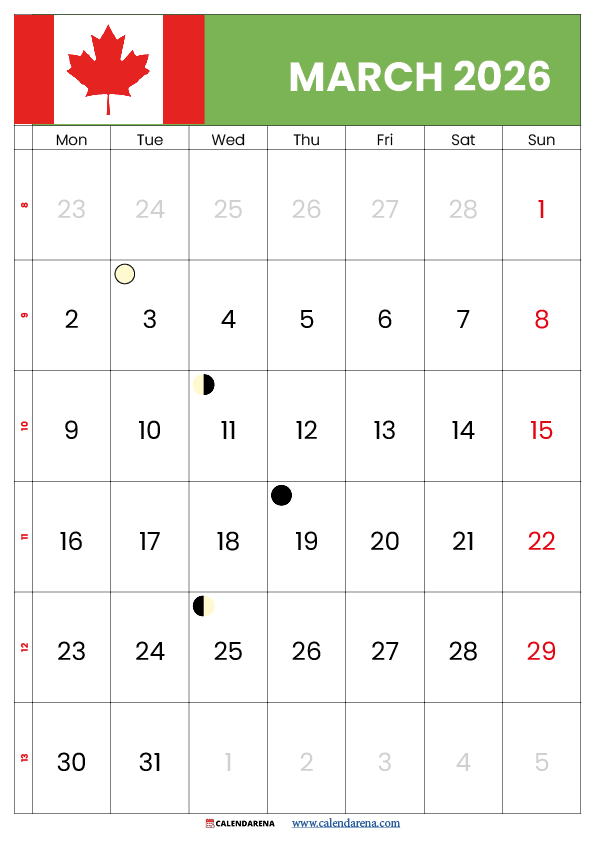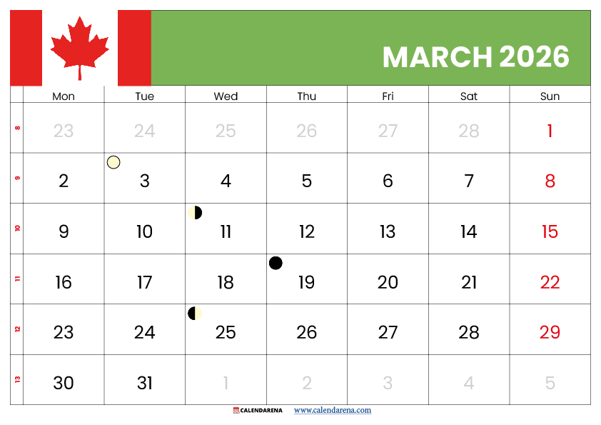 March 2026 begins on Sunday and contains 31 days, offering five complete weeks for planning and organization. This month serves as a bridge between winter’s conclusion and spring’s vibrant beginning, making it crucial for transitional planning across various life domains. The March Calendar 2026 Canada includes significant holidays, international observances, and natural phenomena like moon phases that influence activities from gardening to fishing.