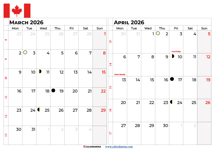 March and April 2026 Calendar Canada
