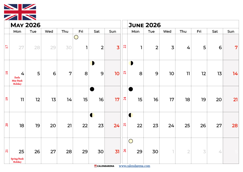 Our downloadable two-month calendars present May and June 2026 side-by-side with all bank holidays clearly marked. May’s two bank holidays (4th and 25th) appear alongside June’s calendar, creating clear visual reference points for extended planning. The format maintains readability despite including 61 days total, using optimised font sizes and spacing.