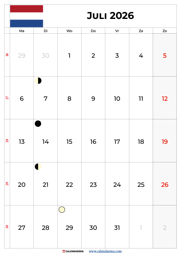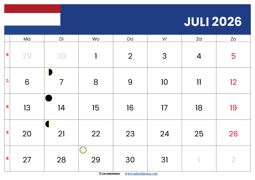 Hieronder vind je de volledige kalender juli 2026 met weeknummers Nederland per dag, inclusief weeknummers en bijzondere data: