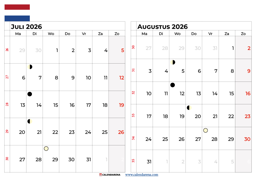 Voor wie de zomer in één overzicht wil plannen, is een gecombineerde kalender juli augustus 2026 Nederland ideaal. Dit bimestrale formaat biedt: