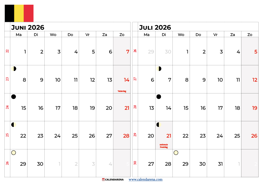 Kalender Juni Juli 2026 Belgie