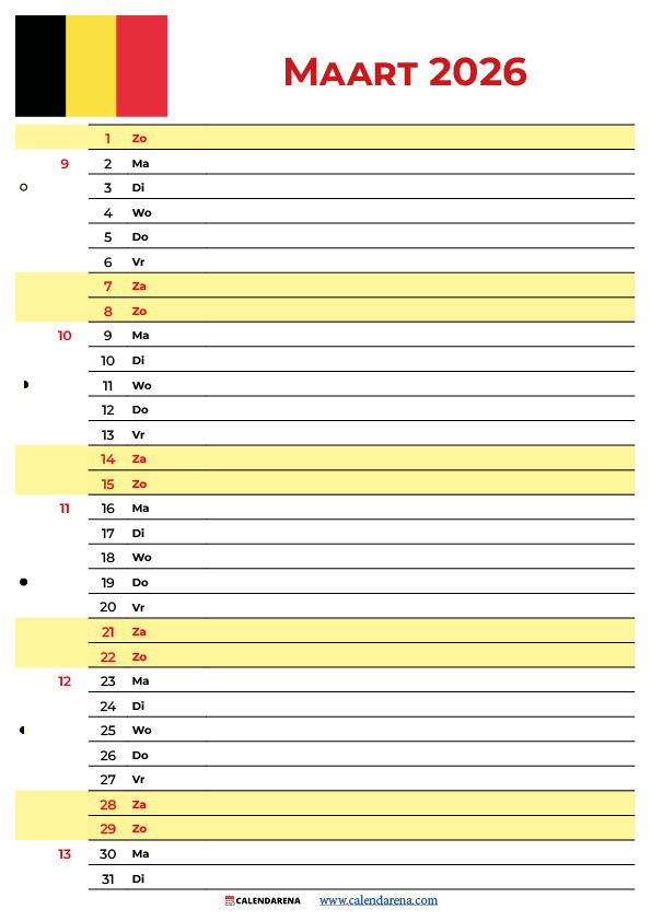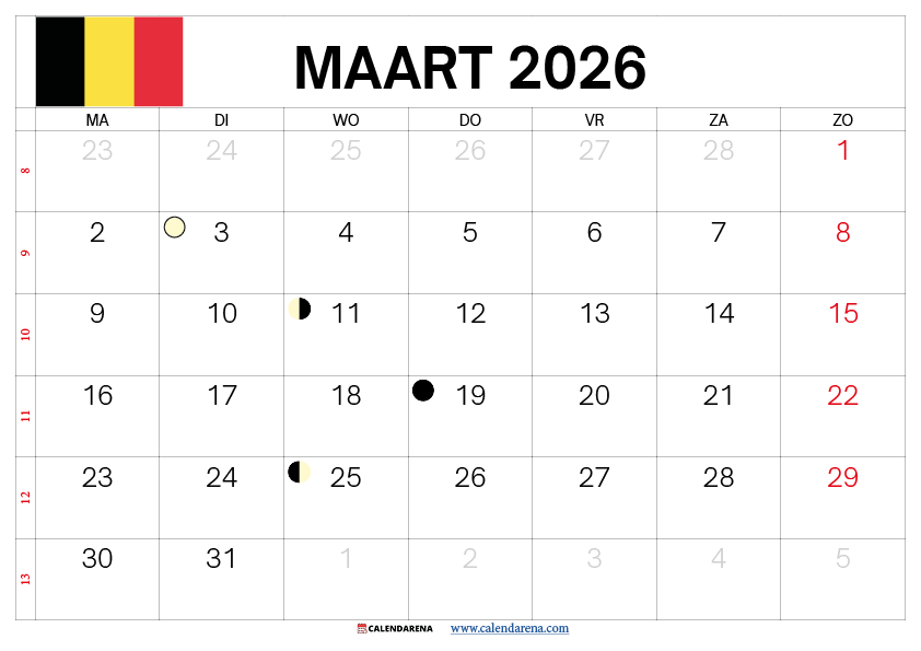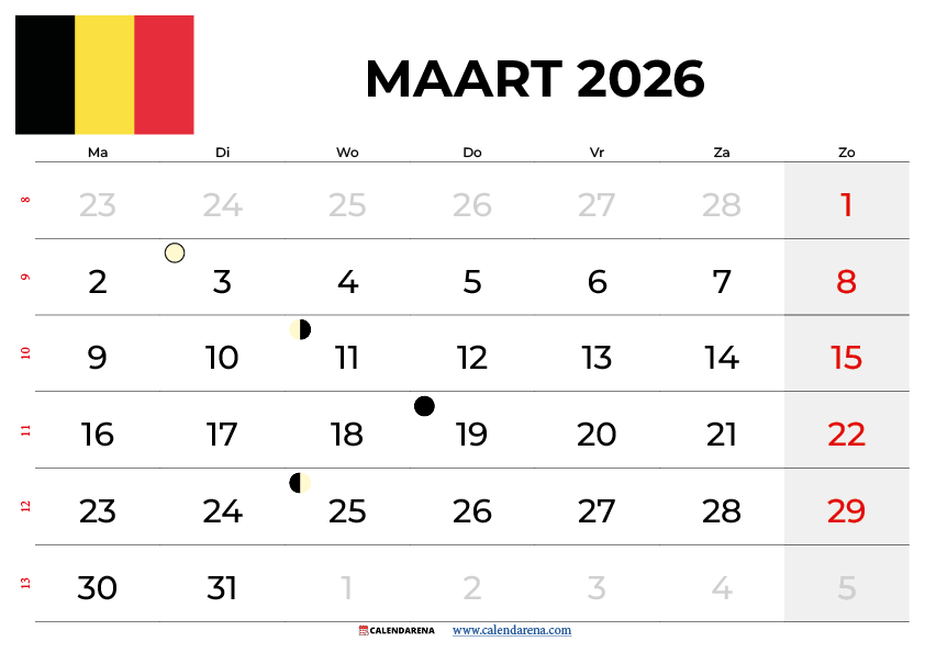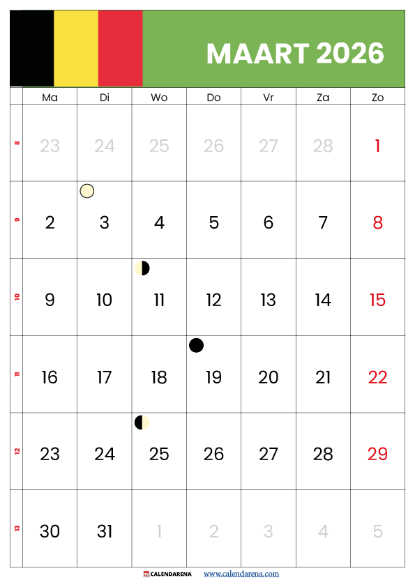 Maart Kalender 2026 Belgie: Verschillende Formaten
