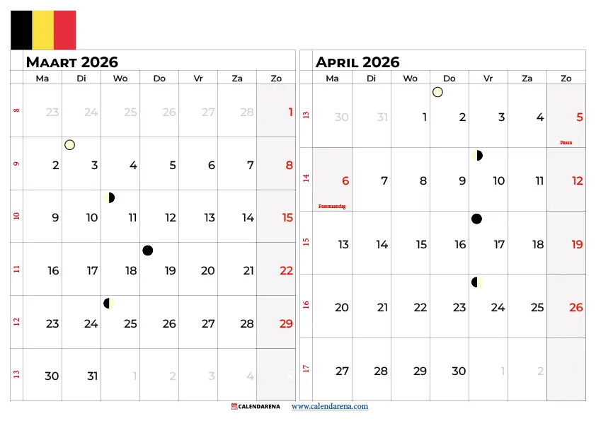 Kalender Maart April 2026 Belgie: Tweemaandenoverzichten