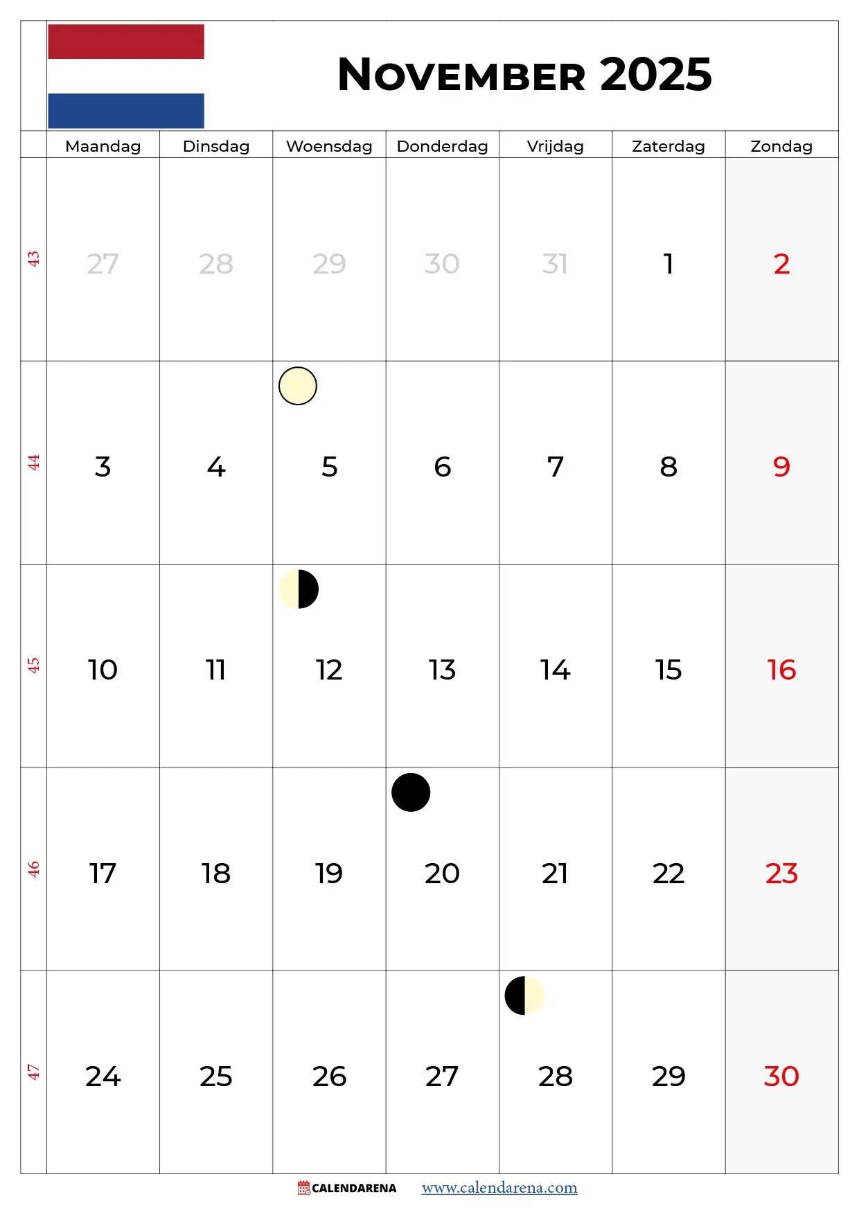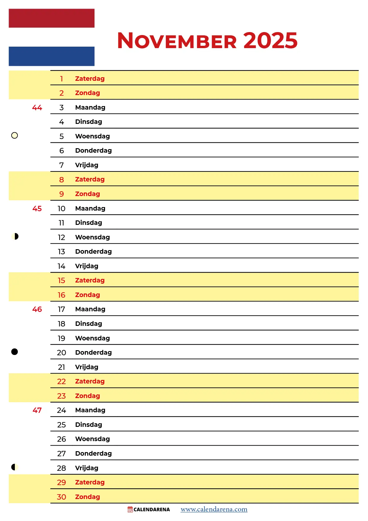 De werkweek heeft een mooie regelmaat met precies vier van elke werkdag. Werkt of studeert u volgens een vast patroon? Dan kunt u nu al zien op welke weekdagen specifieke data vallen. Handig toch, zo’n Kalender 2025 November Nederland?