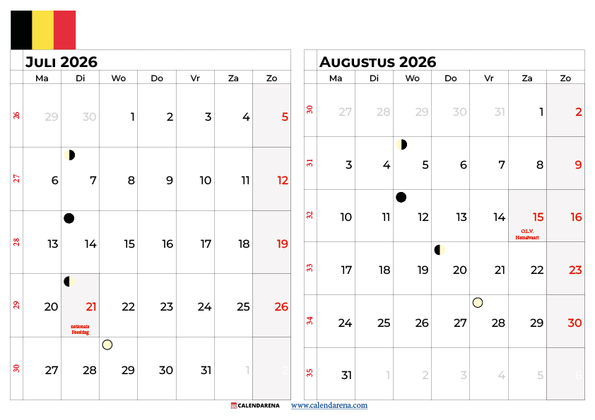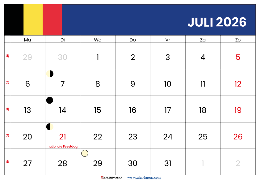 Op Calendarena.com vind je de kalender juli 2026 België in meerdere indelingen: liggend en staand formaat, met weeknummers, feestdagen en maanfasen. Geschikt voor thuis, op kantoor of in de klas. Geen registratie vereist – gewoon downloaden en afdrukken.