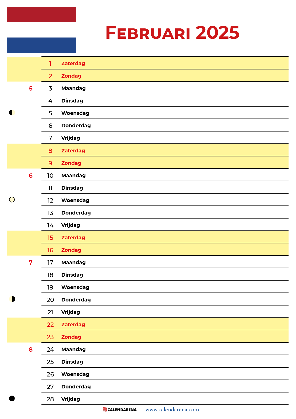 Kalender februari 2025 Nederland met weeknummers Portret oriëntatie Officiële feestdagen en vrije dagen voor Nederland Makkelijk te printen Papier van “A4” formaat Download JPG | Download pdf [su_spacer size=”10″] [su_box title=”Nederland 2025 maandkalenders met feestdagen” box_color=”#fb0400″] Kalender 2025 Nederland – Alle...