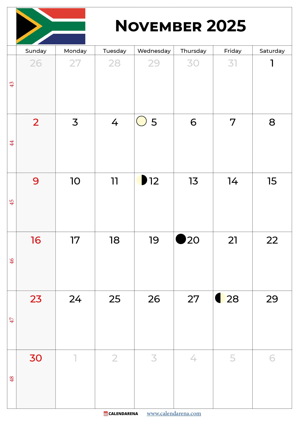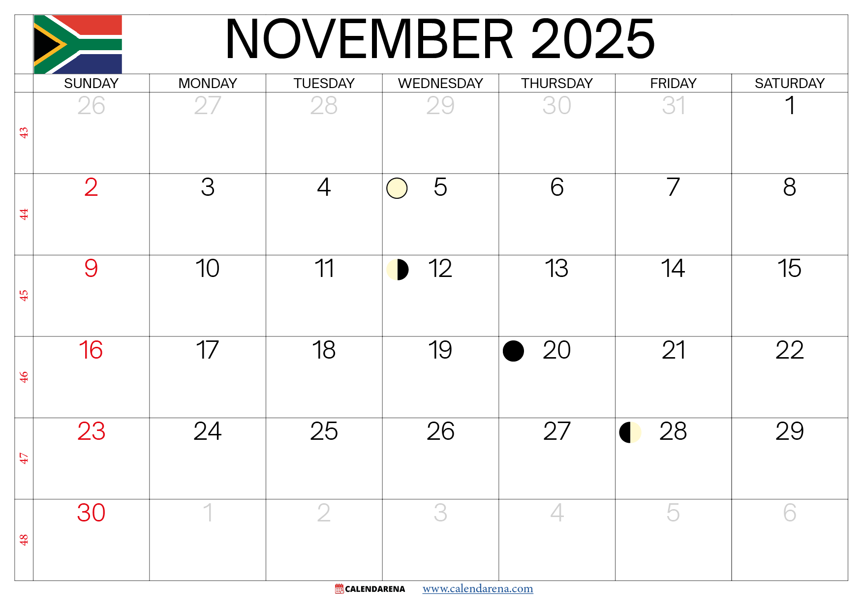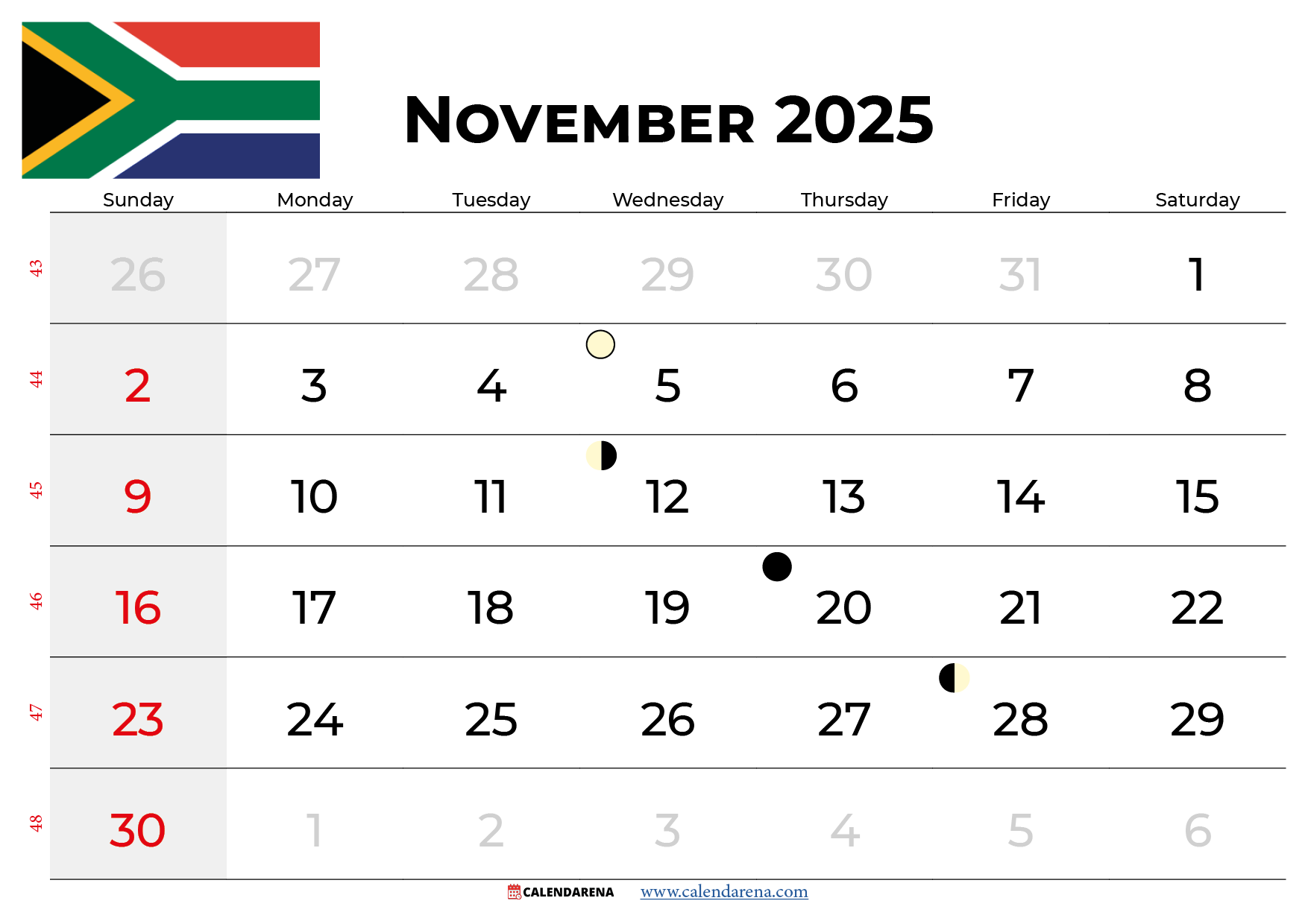Here’s a detailed view of the November 2025 calendar for South Africa: