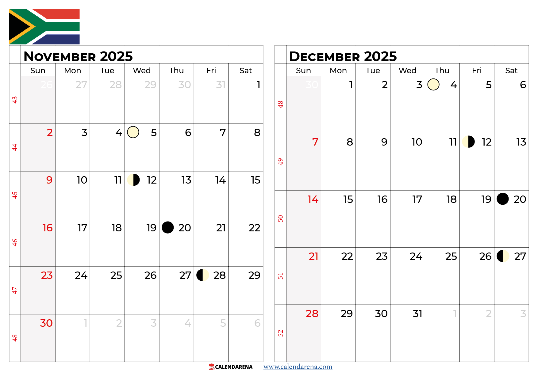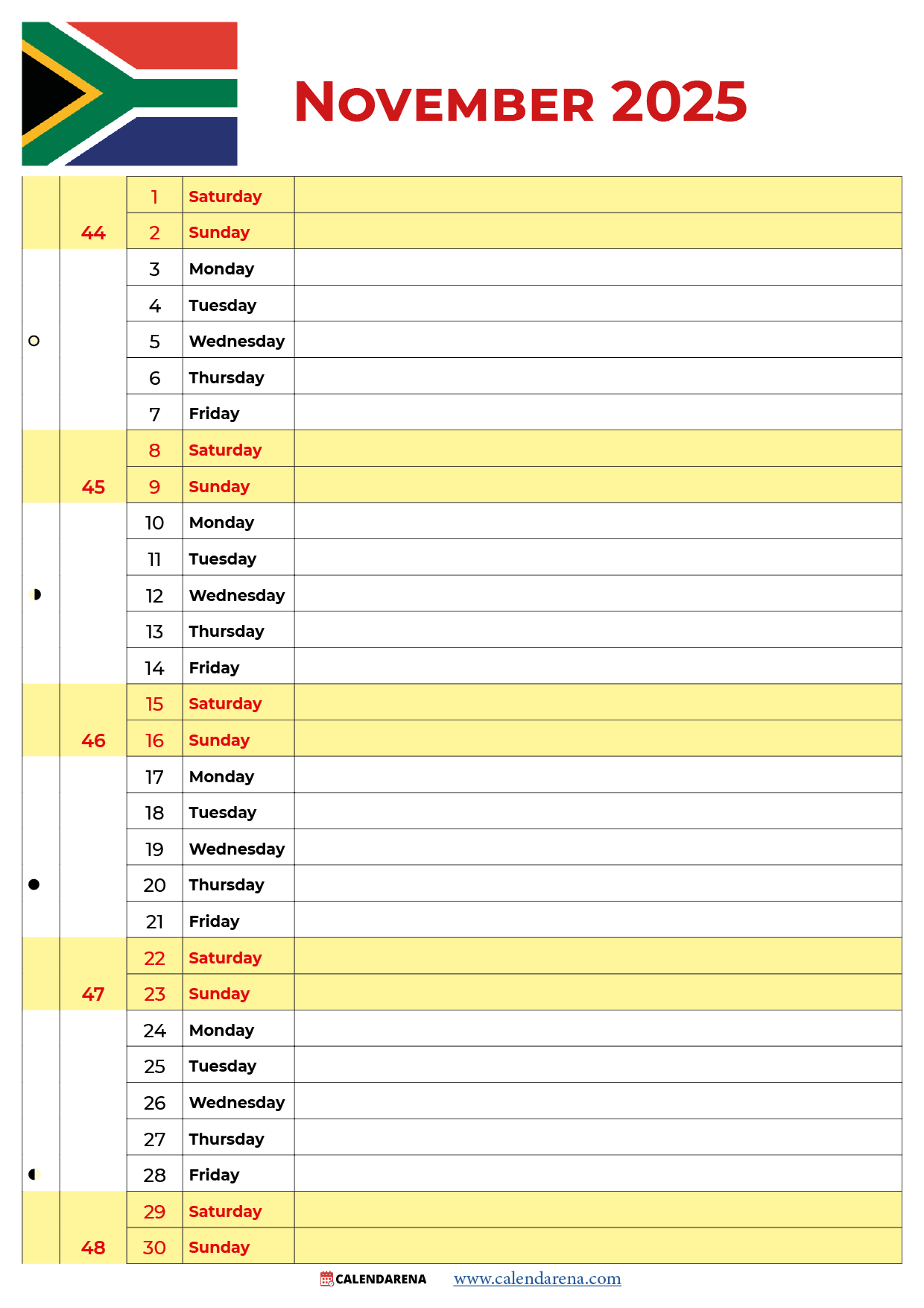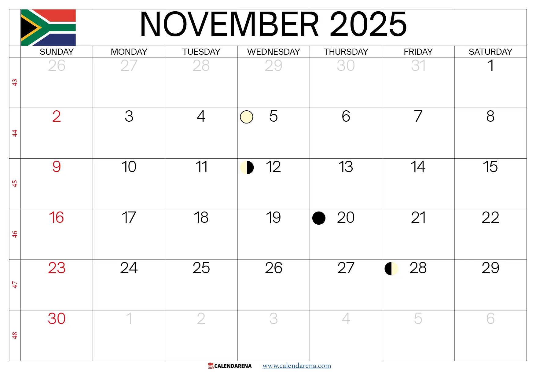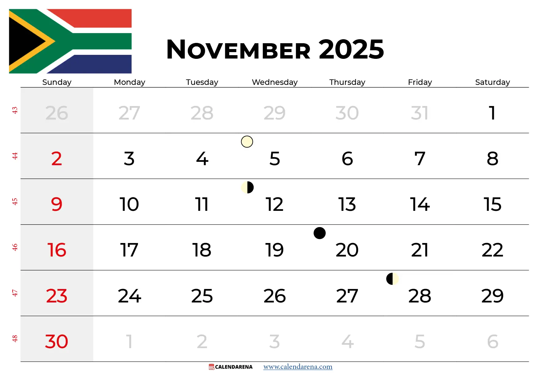 Here’s a detailed view of the November 2025 calendar for South Africa: