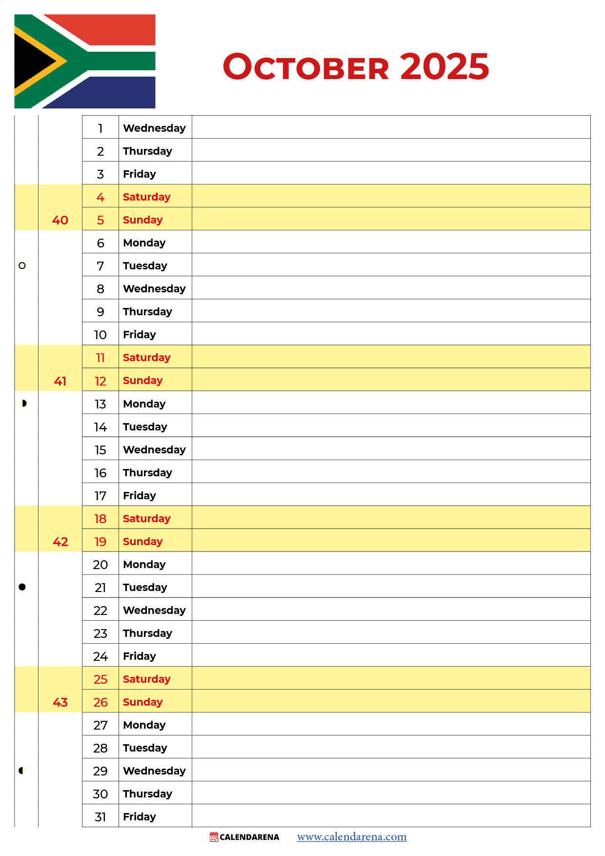 October 2025 in South Africa spans 31 days, commencing on a Wednesday and concluding on a Friday. For those seeking an October 2025 Calendar South Africa, our website offers free downloads in both JPG and PDF formats, ensuring you stay organized throughout the month.