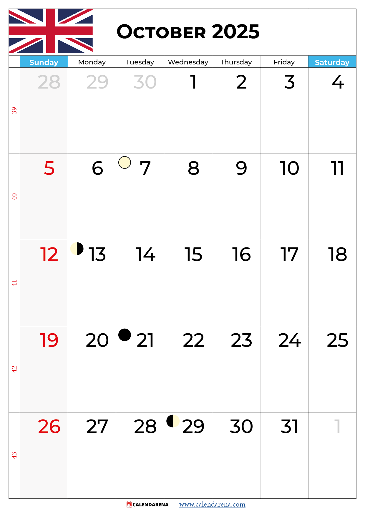 Plan your month effortlessly with our free downloadable October 2025 Calendar With Holidays UK, available in JPG and PDF formats. October 2025 spans 31 days, starting on Wednesday, October 1, and ending on Friday, October 31. Mark key dates like Diwali (October 21), Halloween (October 31), and celestial events such as the Full Moon (October 7) and New Moon (October 21). Perfect for personal or professional use, this calendar ensures you never miss a beat.