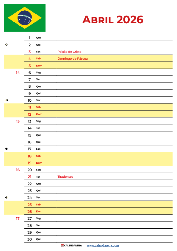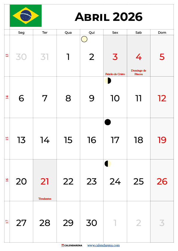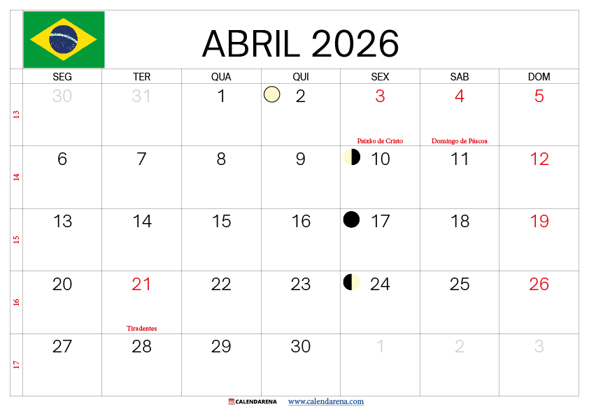 Calendário Abril 2026 Para Imprimir Com Feriados