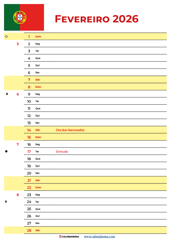 Calendário Fevereiro 2026 Para Imprimir Portugal