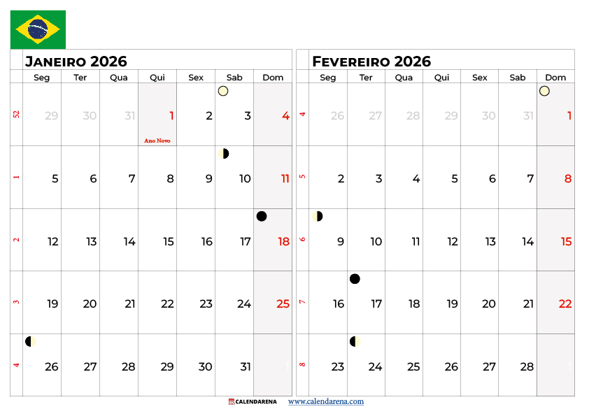 Calendário Janeiro E Fevereiro 2026 Brasil Combinado