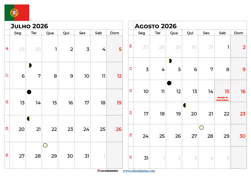 Calendário Julho e Agosto 2026 para Imprimir Portugal