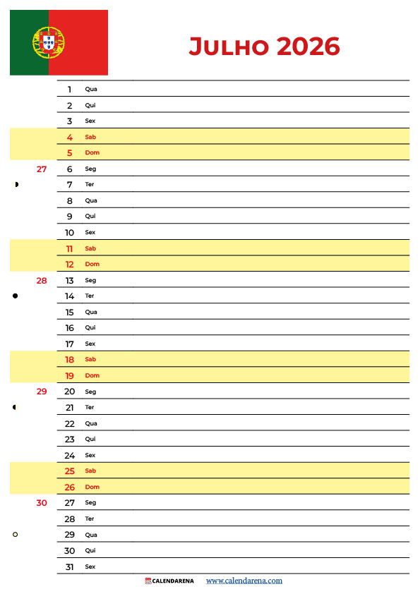 O planeamento da rotatividade de férias deve ser feito com antecedência. O calendário julho 2026 Portugal impresso e afixado no escritório facilita a gestão de ausências e garante que não há sobreposições que comprometam a operação.