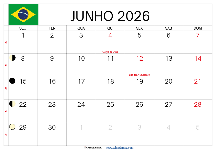 Calendario Junho 2026 Brasil com Feriados