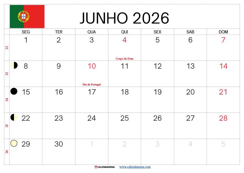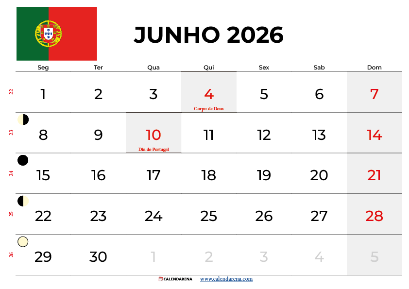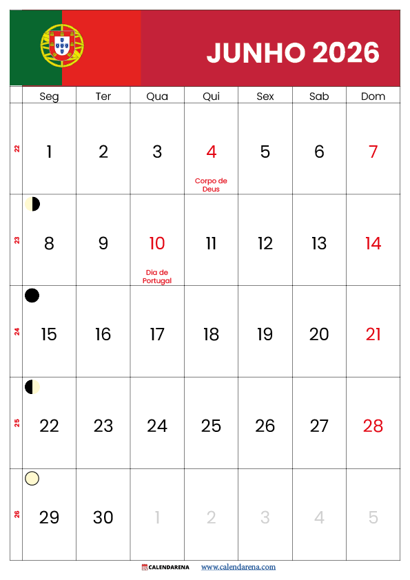O nosso website oferece Calendario De Junho 2026 Portugal para download gratuito em formatos PDF e JPG, prontos para impressão. Estes calendários incluem todos os feriados nacionais e as principais observâncias claramente assinaladas, facilitando a visualização rápida das datas importantes. Pode escolher entre diferentes estilos de design, desde versões minimalistas até formatos mais coloridos e decorativos.
